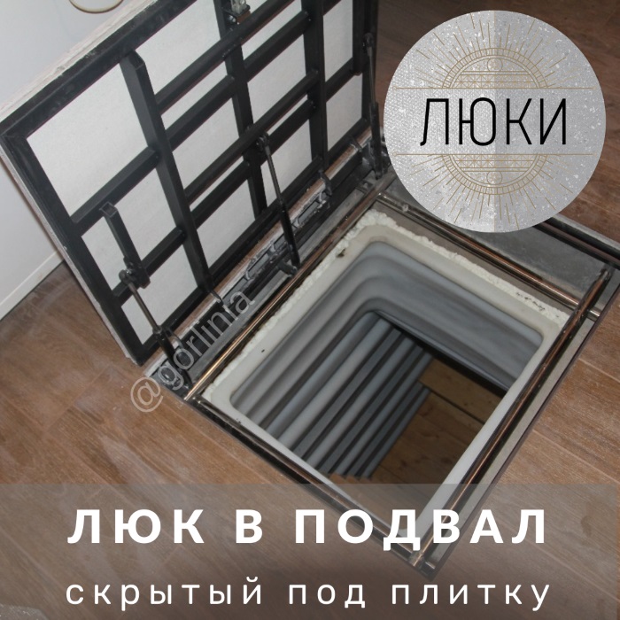 Устройство современного спуска в подполье требует горизонтальной двери, желательно облицованной общим декоративным покрытием (плитка, керамогранит или ламинат) и легко открываемой подъемником.