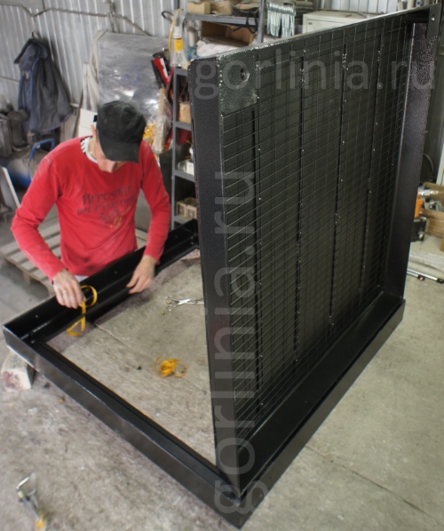 Крышка выпускается из прессованного Г-образного профиля со стальным дном из листа 3 мм, армировка снизу профильной трубой. Сварка аргонно-дуговая сплошным проваром швов с присадками меди. Шарнир: труба 20х20 с пальцем из прутка. После операций грунта и окраски металлокаркас проходит термообработку в высокотемпературной печи.Грузоподъемность люка под брусчатку